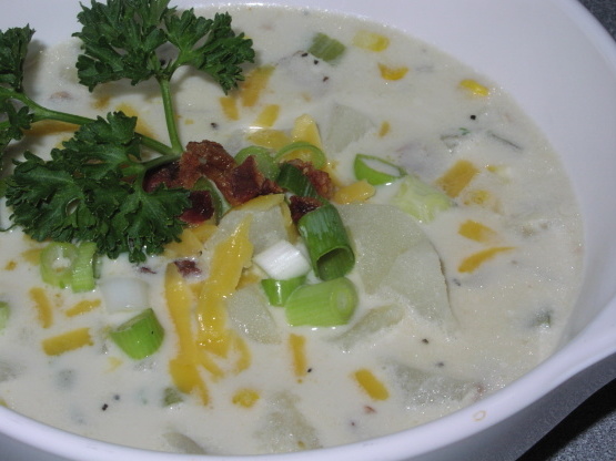 Een bevredigend comfortvoedsel dat kan worden opgedronken met dezelfde toppings die u op een gepofte aardappel (kaas, groene uien, spek) zou zetten. Dit is een geweldige soep voor een pechvogel, omdat het universeel wordt genoten door kinderen en volwassenen .OPMERKING: De originele versie belde half 'n half, maar ik heb gemerkt dat melk prima werkt.