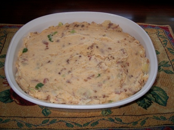5. Stoof in zure room, roomkaas, geraspte cheddar kaas, spekjes (ik gebruik Oscar Meyer of Hormel. Ze komen in 85 gram. Recipiënten dus gebruik ik de helft) en groene ui (dun gesneden inclusief de groene toppen).