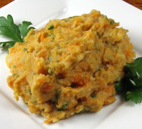 Dit recept, gebaseerd op een recept van Cooks Illustrated, is een mooie variatie op traditionele aardappelpuree. (Ik heb minder vet ingrediënten gebruikt om de calorieën te verminderen) De kleur is gewoon ongelooflijk. En de wortels voegen een zoetheid toe die in het bijzonder varkensvlees complimenteert. de meeste puree recepten, dit bevriest ook goed.