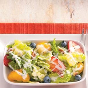 Top met de aardbeien, ananas, sinaasappels en bosbessen.Sprinkle met pecannoten.Drizzle met dressing..