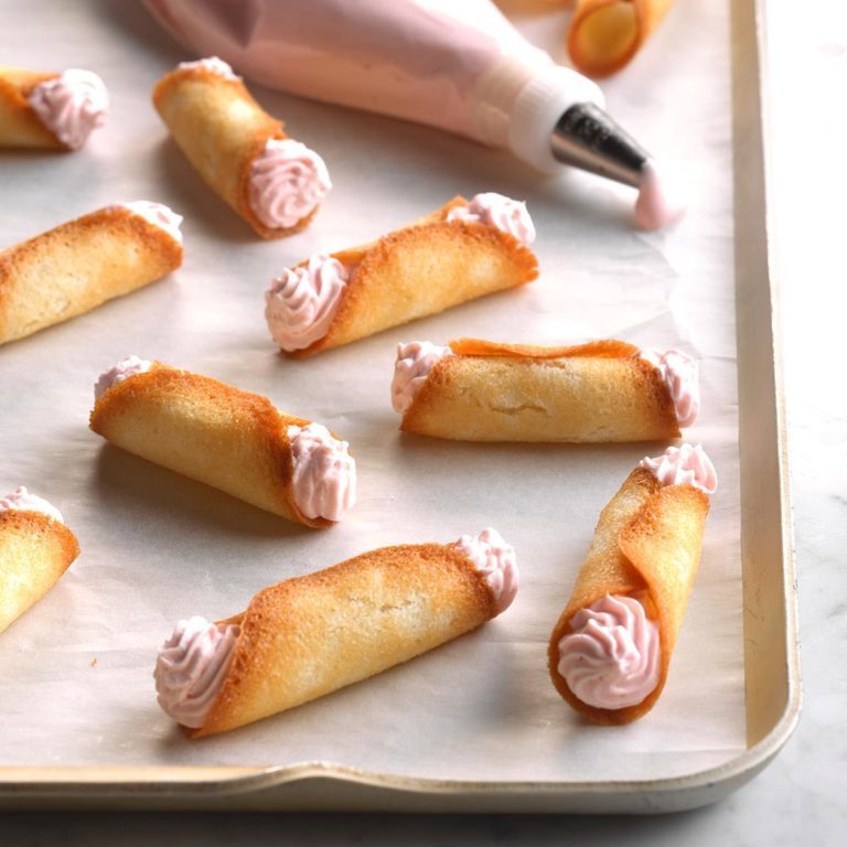 Maak elke koek los en krul rond een houten lepelhandvat. Druk zacht om te verzegelen; tot ongeveer 20 seconden vasthouden.Overschakelen op vetvrij papier om af te koelen.Verhaal met de resterende koekjes.Als cookies te koud worden om vorm te geven, keer dan 1 minuut terug naar de oven om ze te verzachten.