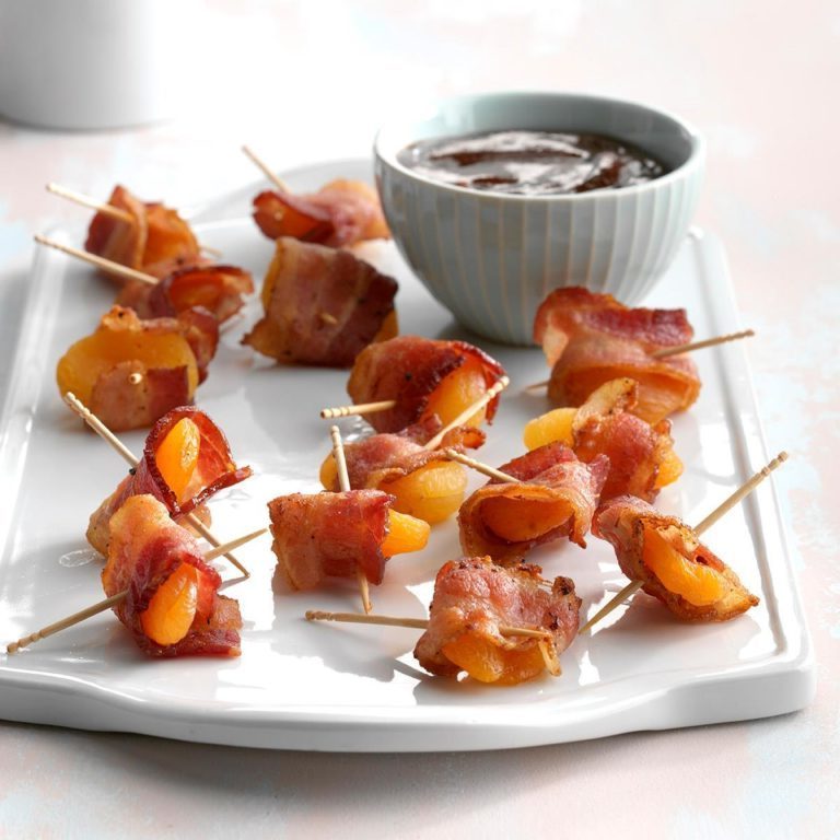 Bak op 350 ° tot spek knapperig is, 18-22 minuten. Meng ondertussen in een kleine kom de barbecuesaus, honing en mosterd. Serveer met warme abrikozenbeten.