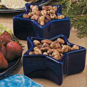 In een grote magnetron-veilige kom, combineer de eerste zes ingrediënten. Magnetron, onbedekt, gedurende 45 seconden op hoge stand. Stir; kook 30-60 seconden langer of tot stroperig. Voeg noten toe; roer om te coaten.