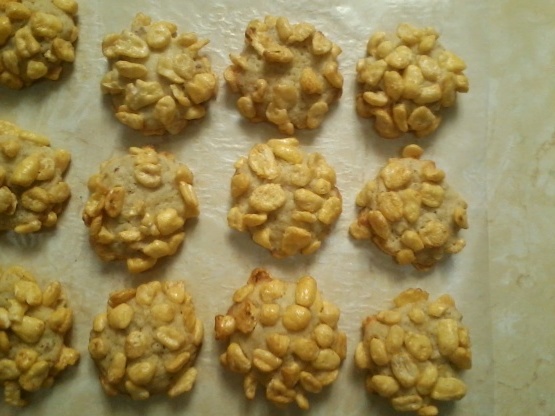3.Vormde afgeronde meet-theelepels of 1,5 koekenlepel deeg in balletjes. Rol in CORN POPS cereal.Plaats op ingevette bakplaat.