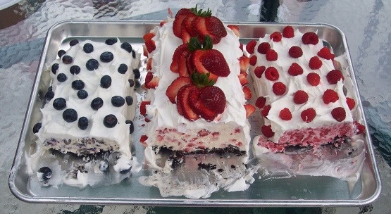 Dien op de plaat om te serveren. Verwijder de folie. Vorst met het resterende geklopte beleg. Bedek met de resterende bessen en extra ertsen.