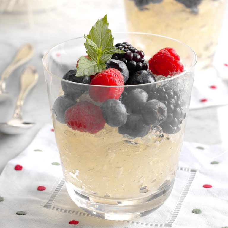 Mijn zus gaf me dit recept een paar jaar geleden toen ik op zoek was naar een elegant fruitgerecht om de gasten te bedienen. Ik serveer soms deze feestelijke fruittraktatie bij de brunch, vlak voor het hoofdgerecht. Het is ook sprankelend en speciaal genoeg om te verdubbelen als een licht dessert. - Andrea Barnhoom, Scottsville, New York