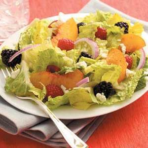 Geladen met verse perziken en bessen, zegt deze salade 'zomer'. Gemaakt door Maryvonne Martin uit Orangevale, Californië, het is een geweldige aanvulling op gegrild vlees, gevogelte of zeevruchten.