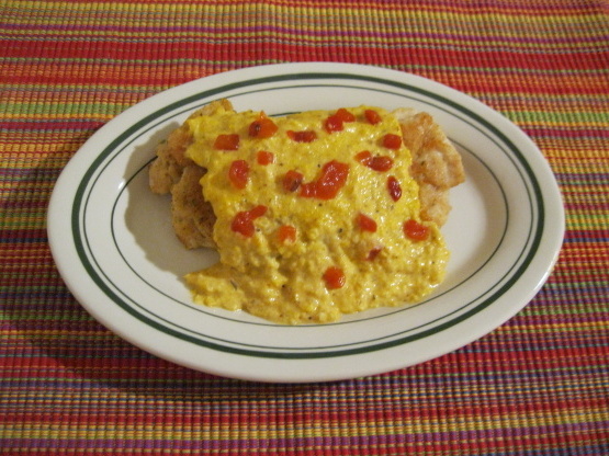 Plaats een borst op elke serveerschaal, bedek met maïssaus en bestrooi met piment.