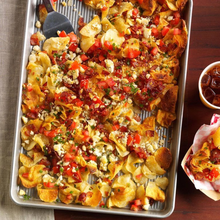 Game-dag vraagt om iets gewaagd. Ik top chips met tomaten, spek en lichtzurige blauwe kaas. Ik maak twee grote pannen en ze verdwijnen altijd. - Bonnie Hawkins, Elkhorn, Wisconsin