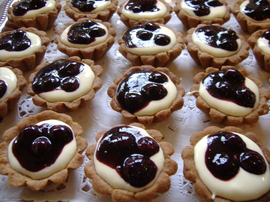 30 minTaartjeskaas, suiker, vanille-wafels, eieren, vanille-wafels, bosbessen taartvulling,bosbessen roomkaastaartjes -