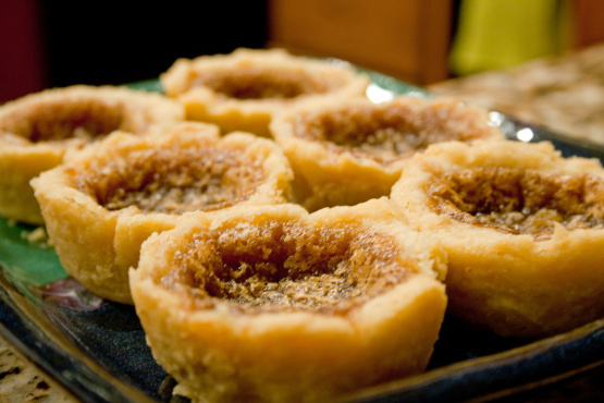 Strooi 5 of 6 rozijnen (of walnoten of pecannoten) in de bodem van elke scherpe shell. Deze taartjes zijn ook heerlijk zonder iets erin.