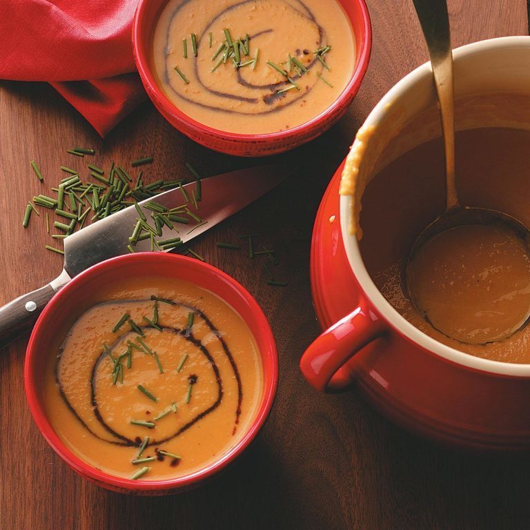 Peren geven deze oogstsoep een aangename zoetheid en een mooie fluweelachtige afdronk, terwijl curry en gember een heerlijke smaak geven. Sarah C.Vasques, Milford, New Hampshire