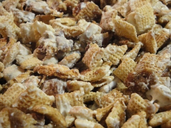 In een kleine magnetronbestendige kom, magnetron witte vanille bakchips en shortening onbedekt op hoge ongeveer 1 minuut of totdat chips soepel kunnen worden geroerd. Sprenkel het graanmengsel; laat staan tot het klaar is. Breek in hapklare stukjes.