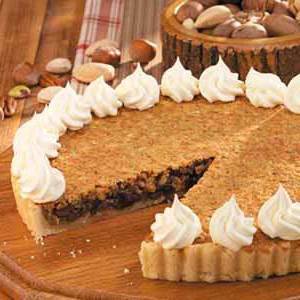 Een boterachtige zandkoekkorst bevat een verrukkelijke vulling gemaakt met chocolade en een mix van gehakte pistachenoten, amandelen en pecannoten. Het is indrukwekkend en toch gemakkelijk te bereiden. Ik garandeer je dat het een van je meest gevraagde desserts wordt. - Debbie Cross, Sharon, Pennsylvania