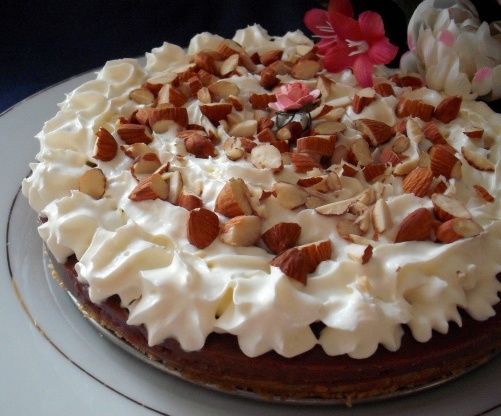 Smeer de slagroom over de afgekoelde vulling en besprenkel met de gebarsten hazelnoten erover en leg deze in de koelkast tot de serveringstijd.