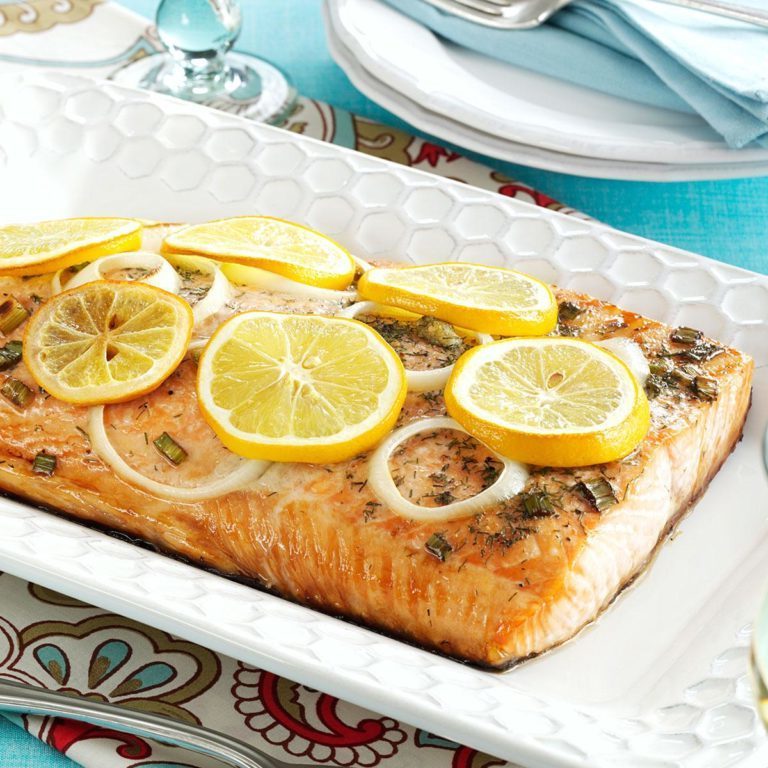 Deze malse en schilferige vis is geweldig om te dienen voor familie en vrienden. Een hartige marinade met dille geeft de zalm overheerlijke smaak en aangezien hij gegrild of geroosterd kan worden, kun je er het hele jaar door van genieten! -Aelita Kivirist, Glenview, Illinois