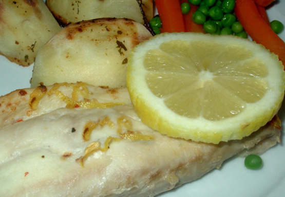 In 4 liter hersluitbare voedselopslag plastic zak, mix dressing, citroenschil en citroensap. Voeg heilbot toe; seal tas en draai om te coaten.