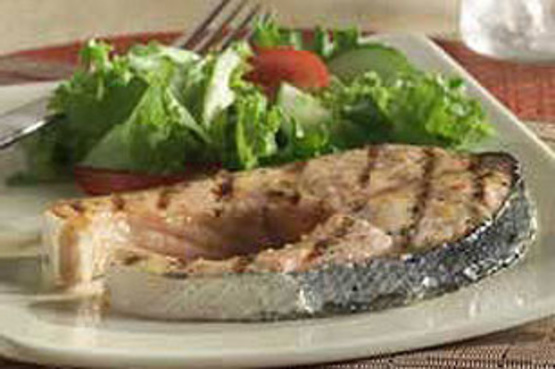 POUR over zalm; cover.Refrigerate 1 uur om te marineren.Drain; gooi het mengsel weg.