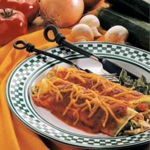 "Door een paar van deze mals mals gevulde pannenkoeken in de vriezer te houden, kan ik ze gemakkelijk opnieuw verwarmen wanneer vegetarische vrienden onverwachts stoppen", schrijft Patricia Moyer van Island, Pond, Vermont. "Bovendien zijn ze een prima manier om te gebruiken extra courgette. "