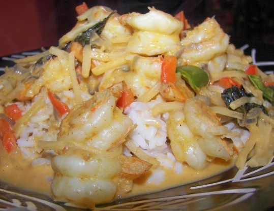 In een grote pan, breng de helft van de kokosmelk langzaam aan de kook en roer constant. Voeg de currypasta en de garnalen toe, roer goed en kook tot het klaar is, ongeveer 5 minuten.