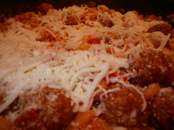 Roer macaroni, gehaktballen, ui en peper erdoor.