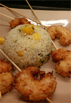 Drijf de garnalen in het bloemmengsel en schud om het teveel te verwijderen. Dompel in de losgeklopte eieren en rol de kokosnoot er stevig in.