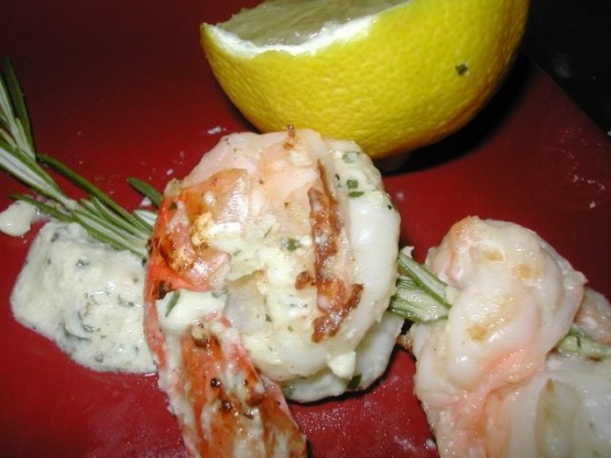 Verwarm vleeskuikens. Bevat garnalen met zout en peper. Doe olie, knoflook en peterselie in een middelgrote kom om te mengen. Voeg garnalen toe; gooi om te coaten. Laat 15 minuten staan bij kamertemperatuur. Garneer garnalen in een laag op grillpan. Zwart tot ondoorzichtig in het midden, ongeveer 2 minuten per kant. Overdracht naar grote kom; bestrooi met citroensap en meng met pesto van 130 liter munt. Begin aan het einde van de rozemarijn en steek 1 garnaal op elke tak. Schik op de schotel en serveer.