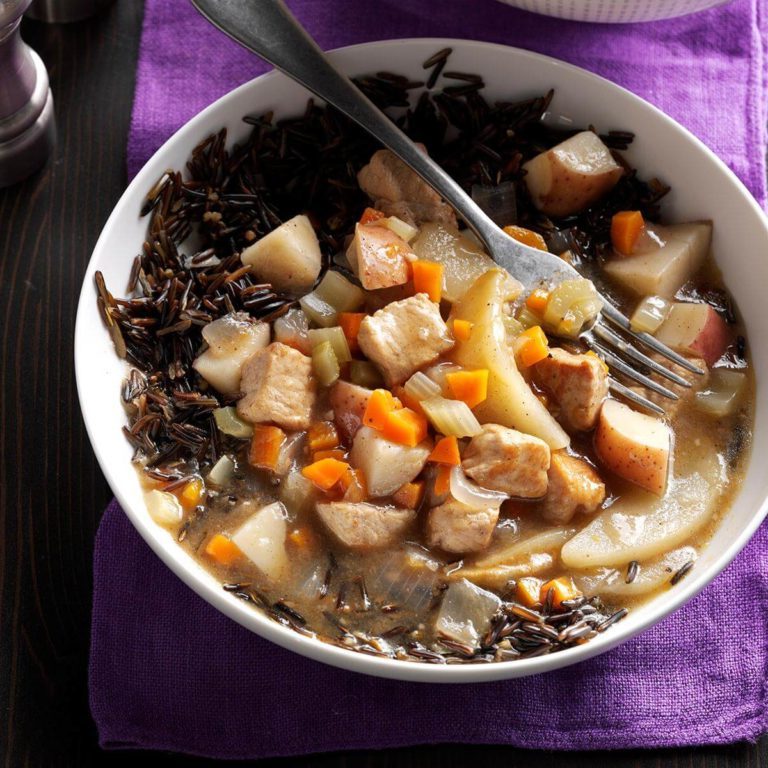 Voeg aardappelen en appel toe.Kook tot ze gaar zijn, 15-20 minuten. Meng maizena en het resterende water tot een gladde massa; roer in stoofpot. Aan de kook brengen; kook en roer tot ze verdikt zijn, 1-2 minuten. Snijd laurierblaadjes af. Bewaar over wilde rijst en, indien gewenst, top met peterselie