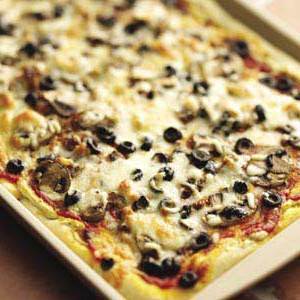 Klop in een kleine kom roomkaas en pesto tot het goed gemengd is. Verspreid over het deeg. Laag met spaghettisaus, worstmengsel, champignons, olijven en Monterey Jack-kaas.
