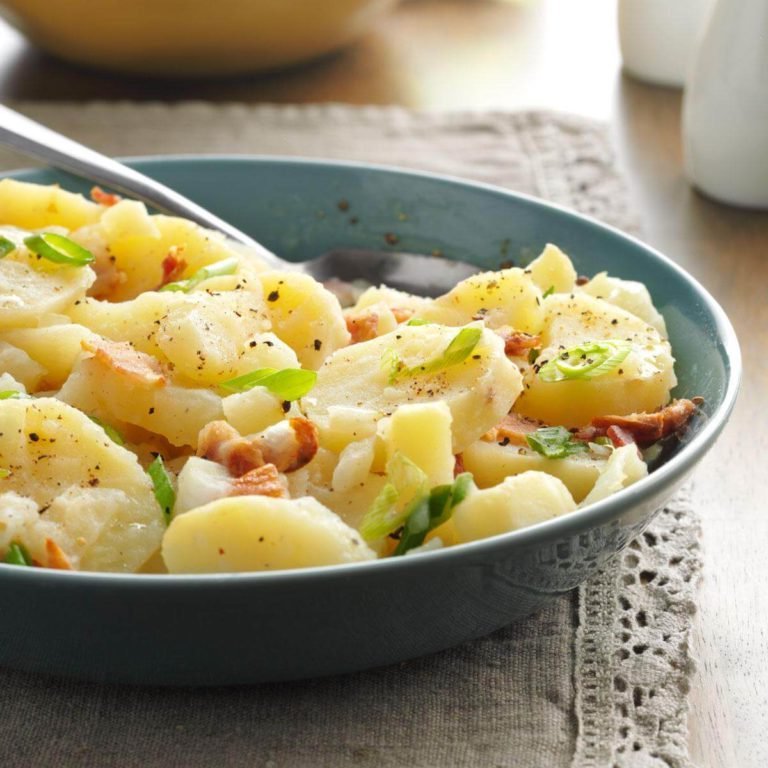 Deze pittige aardappelsalade wekt herinneringen op aan mijn oma, die het voor ons heeft gemaakt. Nu maakt mijn moeder het met brats en zuurkool, echt de beste maaltijd! -Devin Mulertt, Cedarburg, Wisconsin