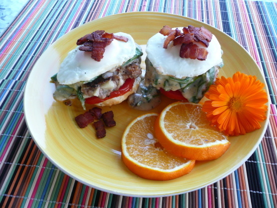 Om te assembleren, open het koekje en plaats het op de serveerschaal.Vervolgens voeg je een plakje tomaat toe aan elke helft, gevolgd door de worstpasteitje. Spat Ranch-saus bovenop de worst, en dan voorzichtig met ei erop. Versier de toppen met spekjes stukken.