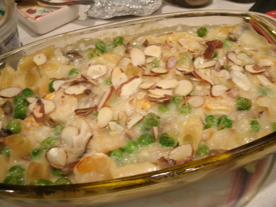 Roer pasta, garnalen en peulen door het paddenstoelenmengsel; giet het in de ovenschaal. Bestrooi met Parmezaanse kaas en amandelen.