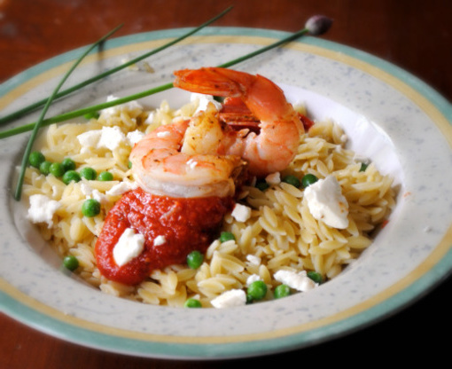 Schep het garnalenmengsel over de orzo.Crumble feta kaas erover en garneren met plakjes citroen.