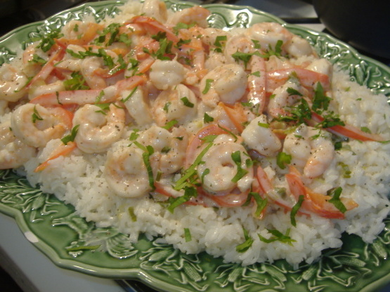 Dit recept stamt oorspronkelijk uit "De eenvoudigste manier om beter te eten: sensationeel thuis koken in drie eenvoudige stappen" maar ik vond het in onze lokale krant. Je kunt voorgekookte garnalen gebruiken en toevoegen nadat de saus is ingedikt. Bewaar gaar rijst.