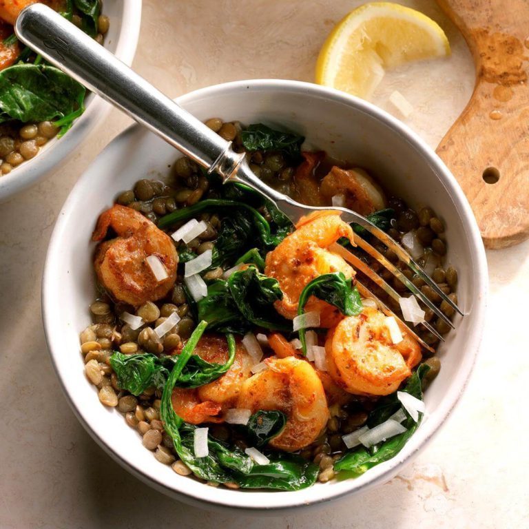 Als je bevroren garnalen, een paar kruideningrediënten, spinazie in zak en linzen bij je hebt in je voorraadkast, kun je dit gerecht in een handomdraai maken. Het is gezond, maar het is zo heerlijk dat niemand het hoeft te weten! -Mary kay LaBrie, Clermont, Florida