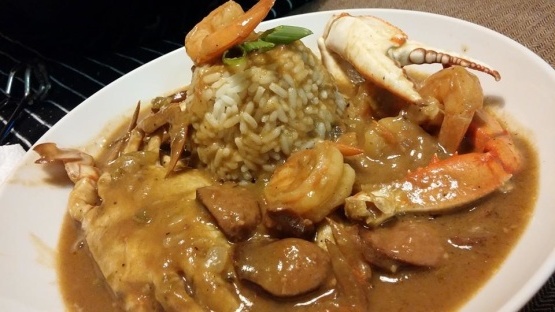 65 minGumbogarnaal, zeekamfers in vieren, meervalfilets in, creoolse kruiden Smokey Creole kruiden, olie-, ui, paprika, poblano chili, selderij, knoflook, tomaten, baai, Worcestershire saus, Chipotle, rijst, kippenbouillon, andouille worsten,cajun jambalaya met meerval, coquilles en garnalen -