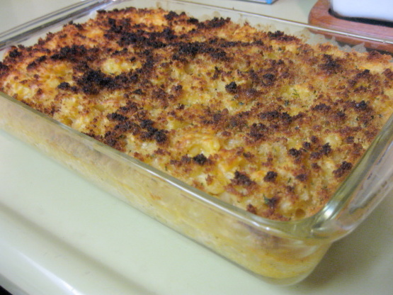Klop de eieren, melk, hete saus en kruiden samen. Roer de pasta erdoor en voeg de kaas toe.Over een laag vuur nog 3 minuten roeren of tot ze romig zijn.Gebakken in ovenschaal en top met geraspte cheddar.top met beboterde broodkruimels en bak 30 minuten op 350.