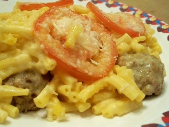 Leg gehaktballetjes in de bodem van een ovenschaal, bestrijk ze met macaroni, bedek met plakjes tomaat besprenkeld met parmezaanse kaas.
