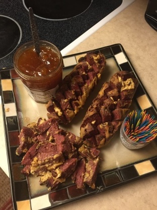 Snijd salami in stukjes en gebruik tandenstokers om te serveren.