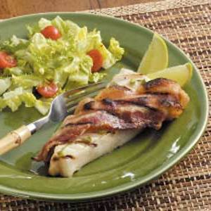 Gegrilde heilbotbiefstuk gewikkeld in spek