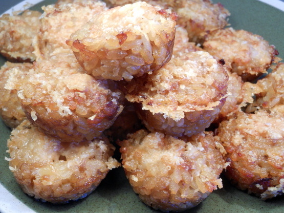 Rol ongeveer 3 theelepels rijst in een bal, maak een gaatje en plaats een blokje mozzarella in de vormrijst om het gat te sluiten (gebruik je eigen oordeel hier, je mini muffinpan kan een iets andere grootte hebben dan de mijne die anders was dan Chriss ').