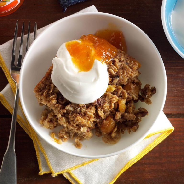Overdracht naar een ingevette 11x7-in.bakschotel.Bak, onbedekt, 25-30 minuten of tot de set en de randen lichtbruin zijn. Snijd in twaalf porties; serveer met toppings.Freeze optie: bevries gekoelde porties havermout in hersluitbare plastic diepvrieszakken. Om magnetron te gebruiken, moet elke portie gedurende 20-30 seconden op hoog staan of totdat ze verwarmd zijn. Bewaar met beleg.