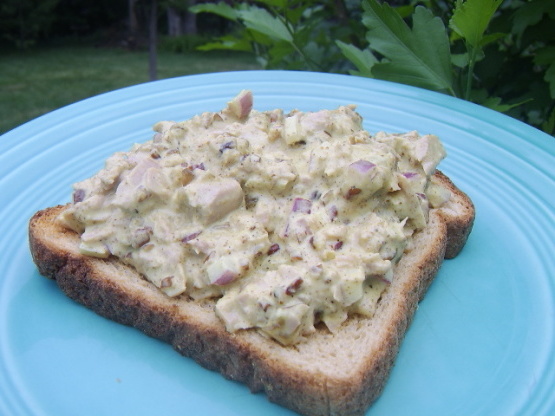 Dit recept werd gedrukt in Penzeys. Een eerste uitgave. Het is een heerlijk verschillende tonijnsalade. Dit gaat geweldig op een pitabroodje, met crackers of op een bedje van groene salades.