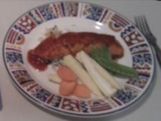 Gepocheerde zalm in een tomaat en chilisaus