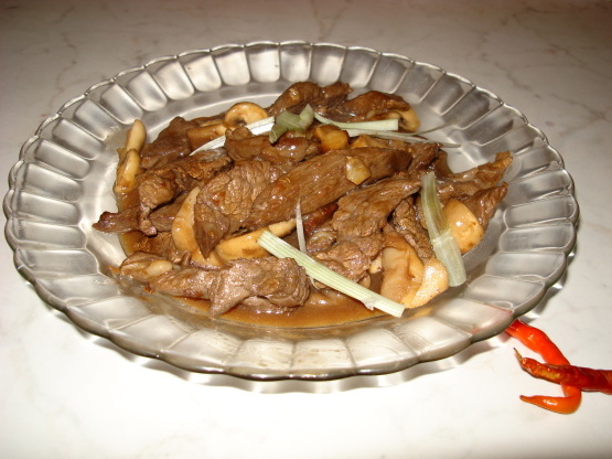 Een eenvoudig en heerlijk gerecht met verschillende soorten champignons. De dunne plakjes rundvlees worden voor het koken gemarineerd gedurende twee uur. Snel om te koken, dit maakt een heel goed gerecht bij het entertainen.