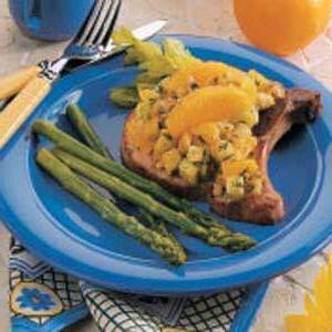 "Inschrijving gerookte varkenskarbonades zijn een leuke afwisseling van het tempo bekroond met een heerlijke vochtige dressing," deelt Rebecca Baird van Salt Lake City, Utah. "Een vleugje sinaasappelsmaak voegt belang toe."