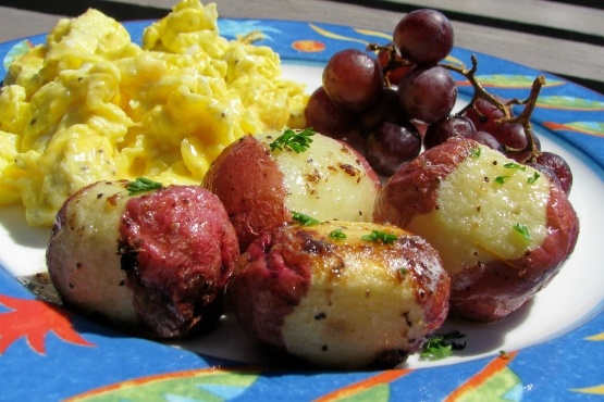 Verrukkelijke koffie! Vooral goed met rundvlees. Kan worden gemaakt in de oven of magnetron! Als u de kleine nieuwe aardappelen niet kunt vinden, gebruikt u rode aardappelen en snijdt u in partjes of wiggen.