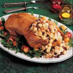 Bak, onbedekt, op 350 ° gedurende 1,75 tot 2 uur of totdat een thermometer 180 ° voor eenden en 165 ° voor het vullen aangeeft.Drain vet als het zich tijdens het roosteren ophoopt. Bedek de eend met folie en laat 20 minuten staan voordat u de vulling en het snijwerk verwijdert .