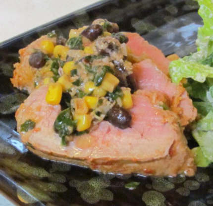 Snijd het varkenshaasje voldoende open om vulling toe te voegen. Voeg gesauteerde fiesta-geïnfundeerde groenten toe aan de binnenkant van het ossenhaasje. Tientallen 3-5 secties met slagerouw/streng laat de opening enigszins bloot. Plaats gevulde varkenshokken in een niet-ingevette braadpanschotel.