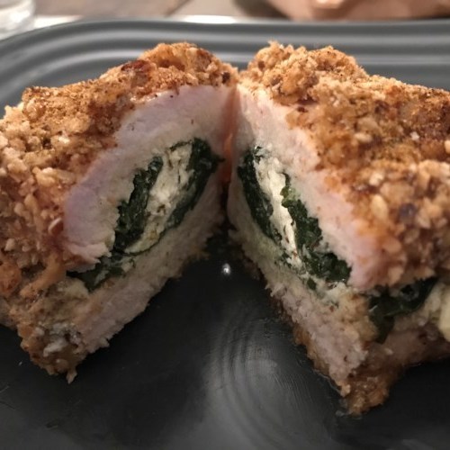 Leg elke hak plat op de snijplank en snij met een scherp mes evenwijdig aan het bord een zak in het varkensvlees, laat drie kanten intact. Stop elk hakstuk met spinazie en dan met kaas.